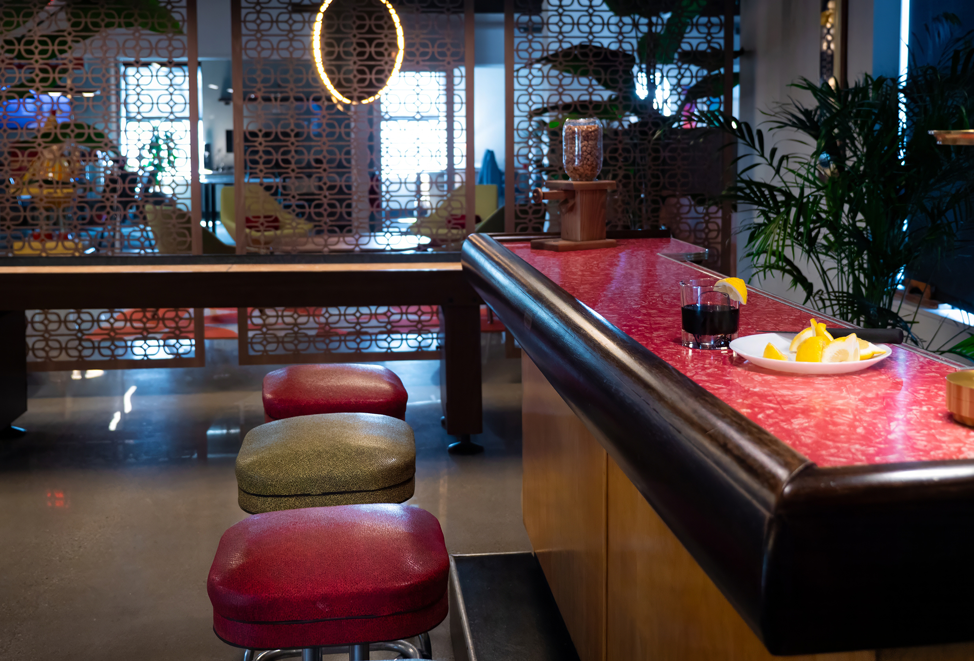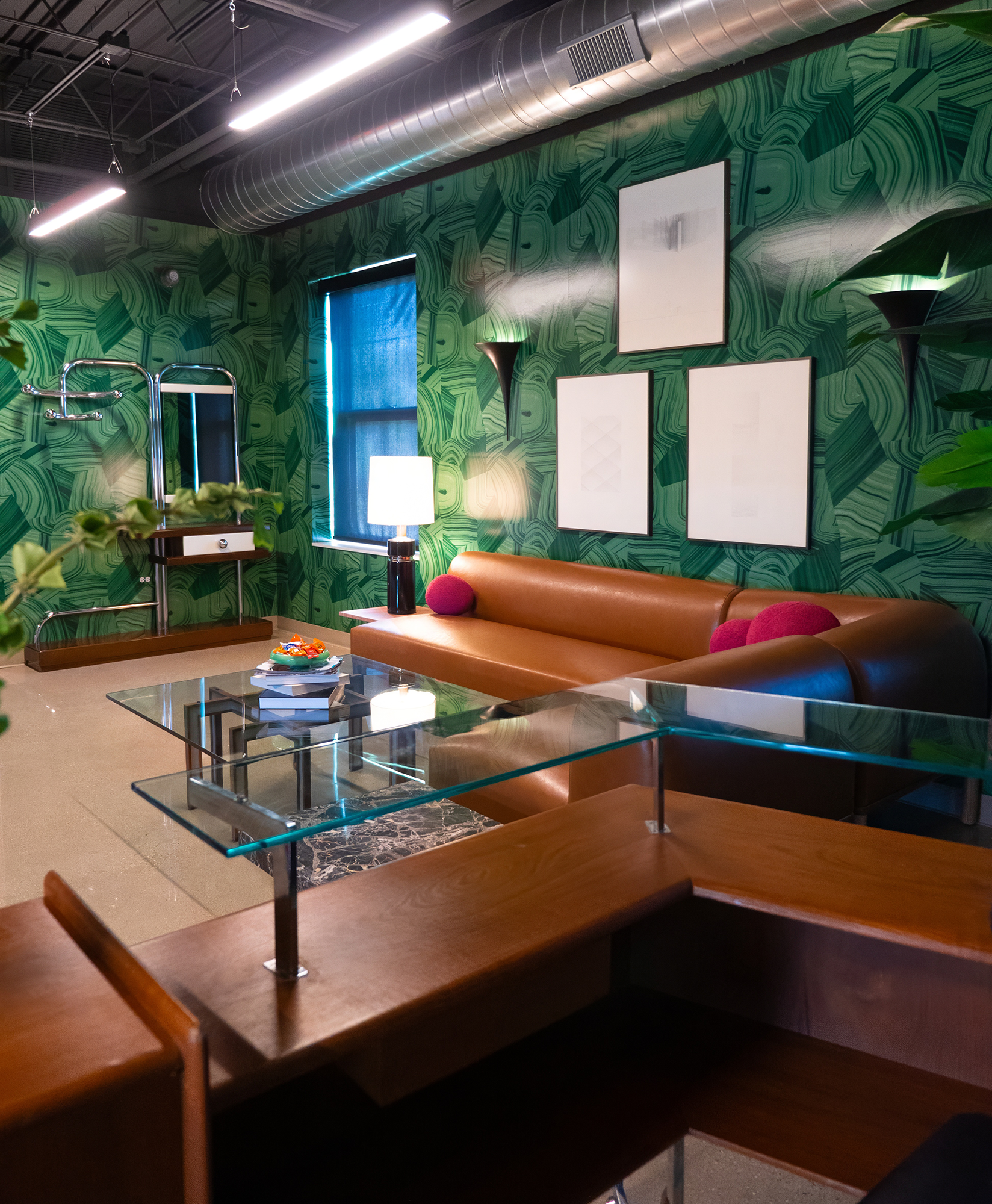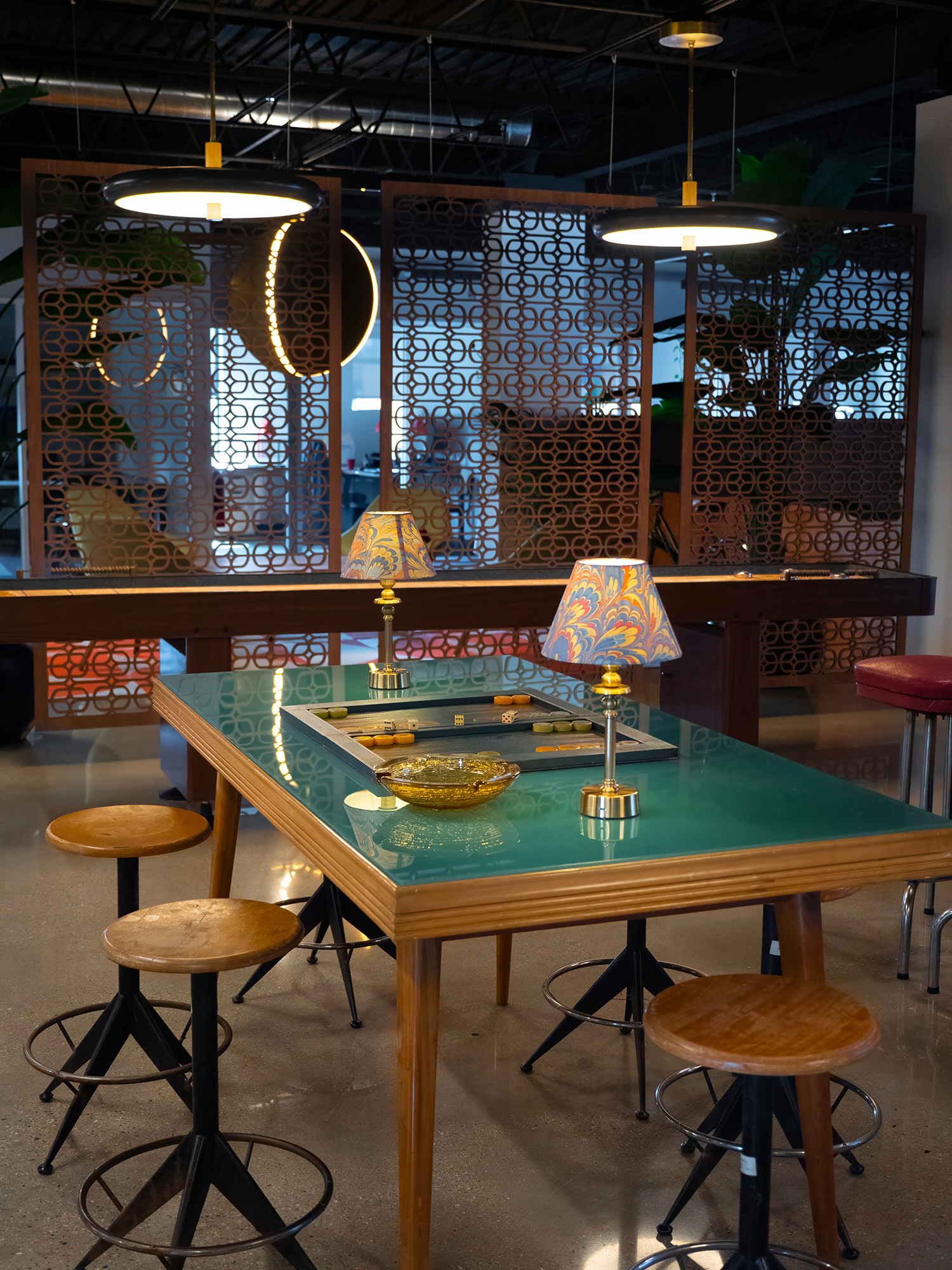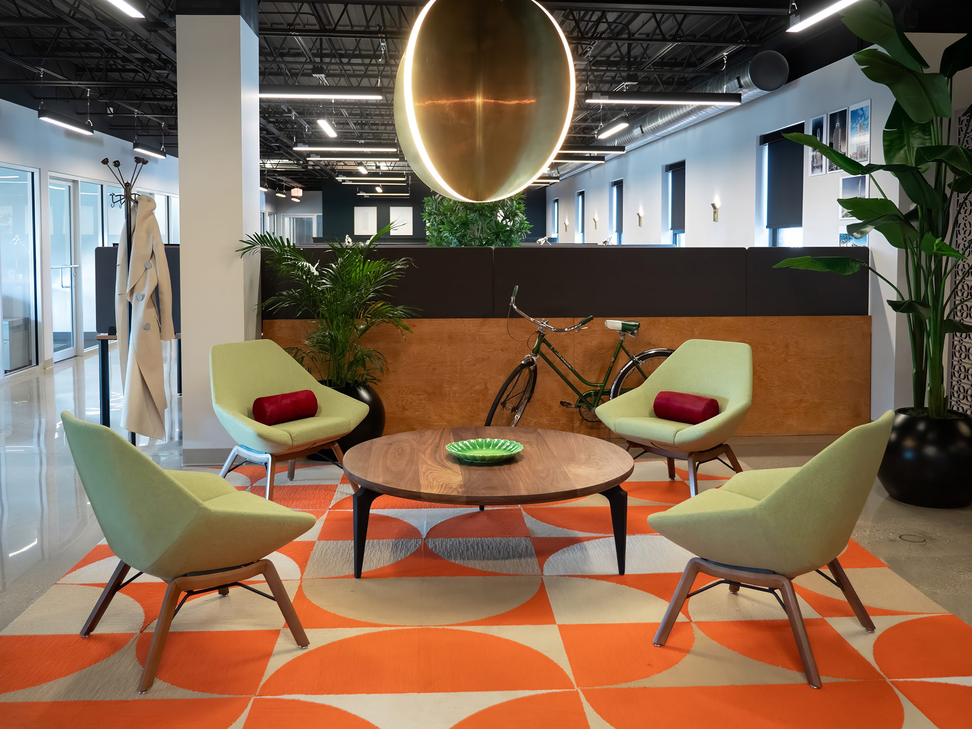 The design combines industrial elements with vibrant color pops, creating a cozy yet dynamic atmosphere. This mix of vintage flair and modern design makes the space full of personality, offering both style and functionality. The result is a unique, welcoming environment that embodies the creative spirit of the office.