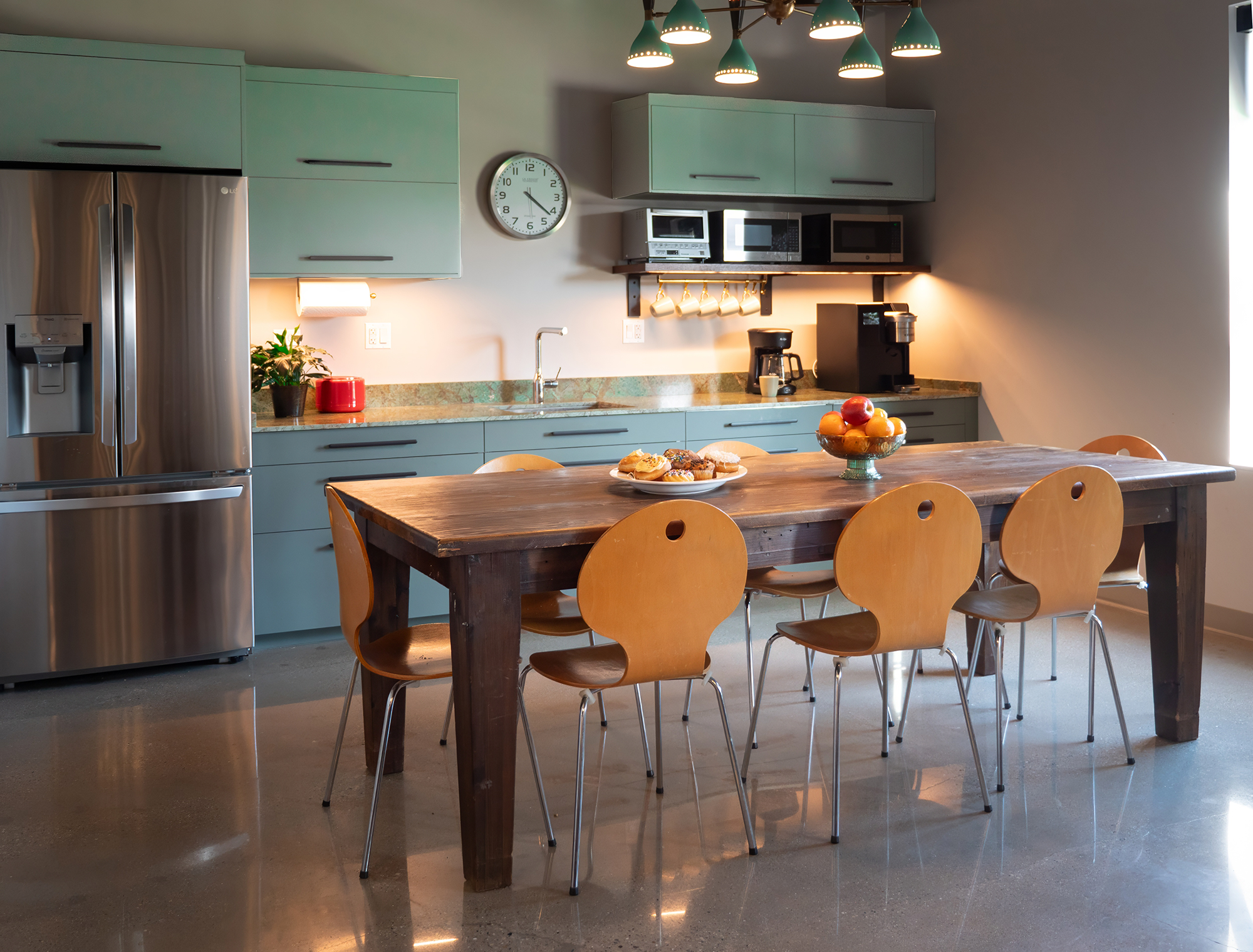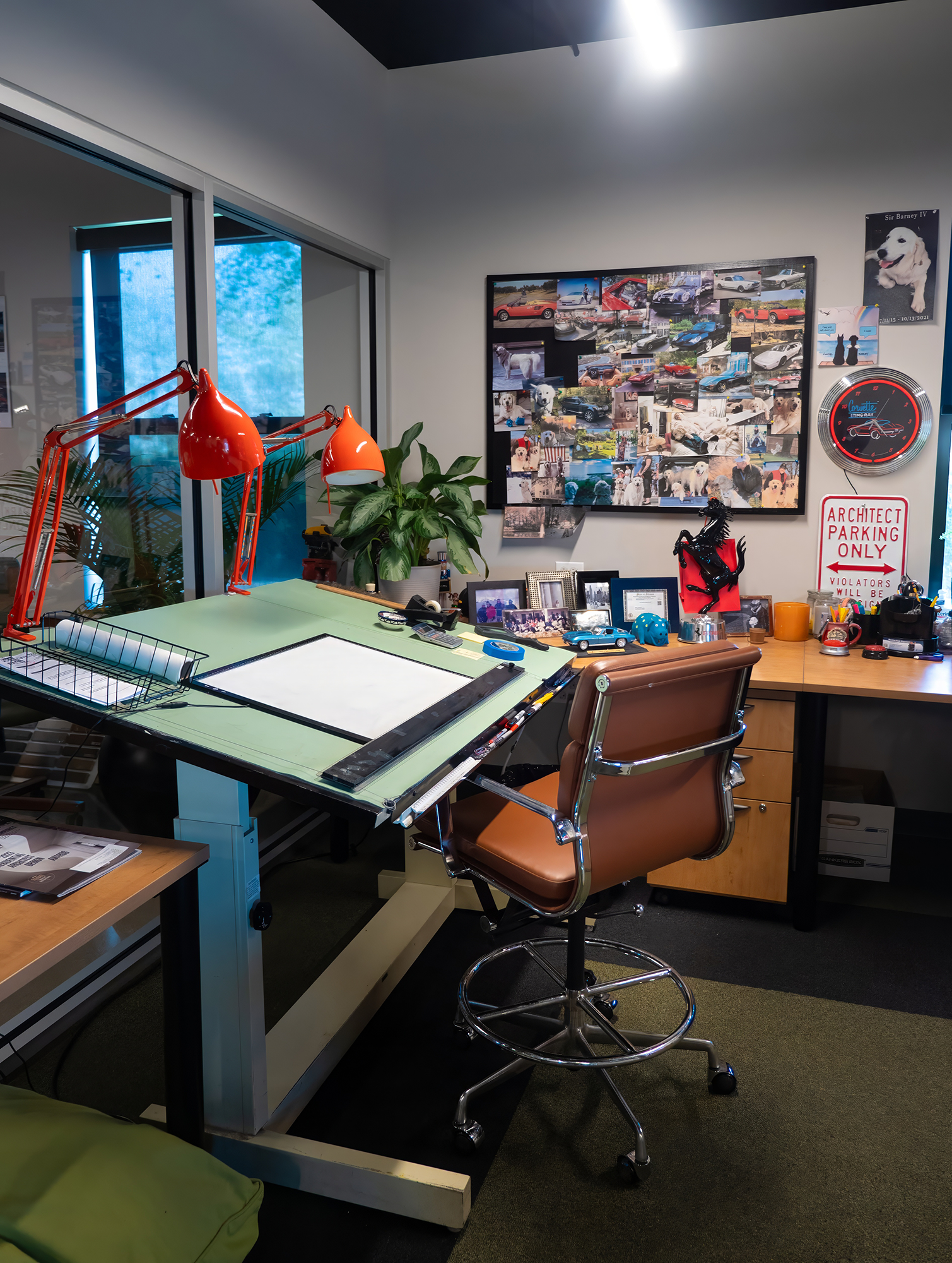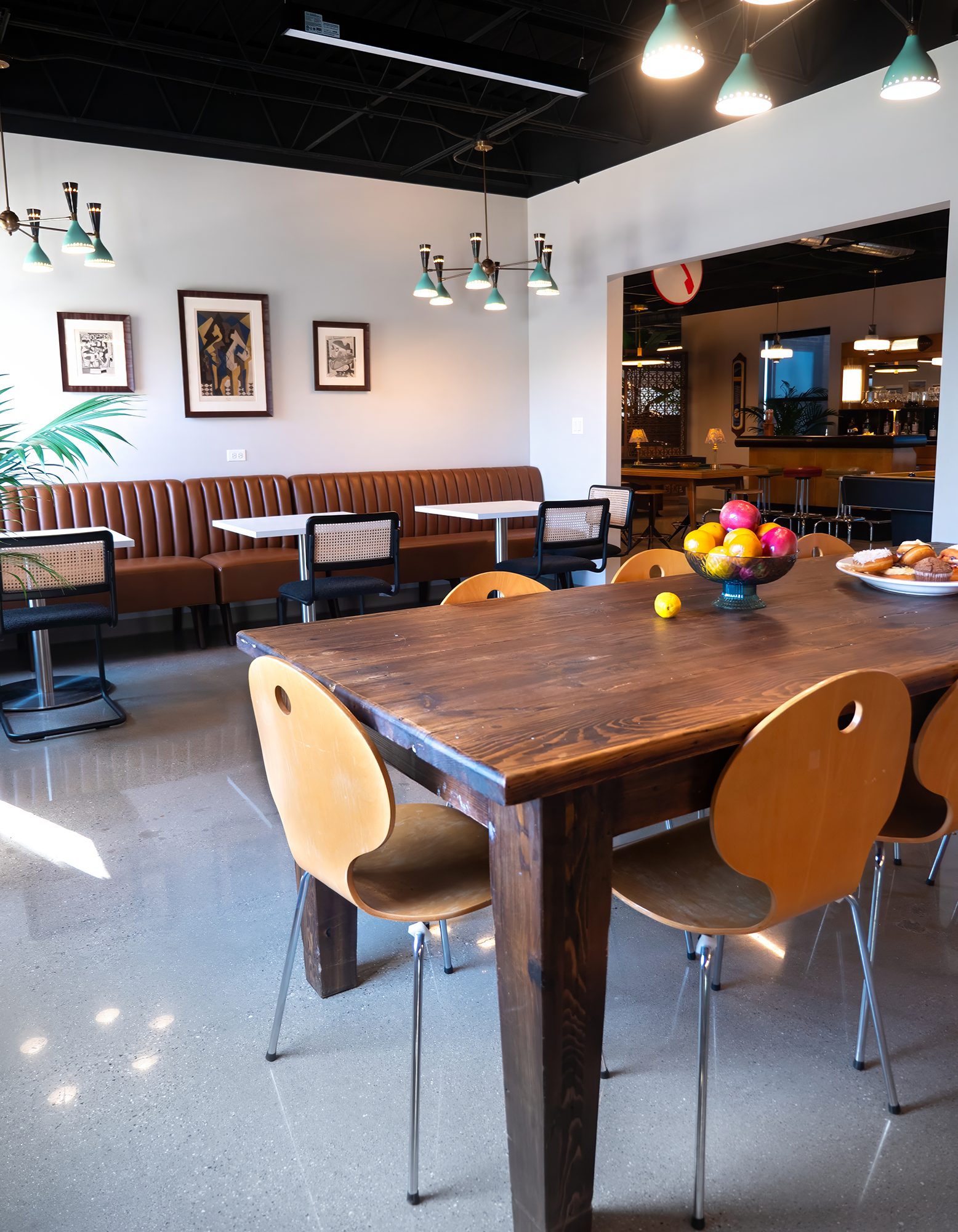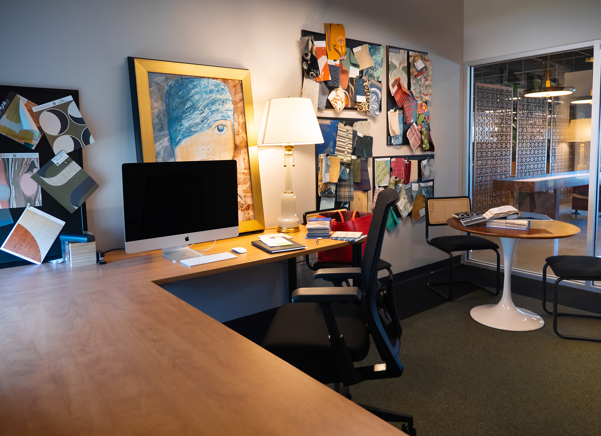 The design combines industrial elements with vibrant color pops, creating a cozy yet dynamic atmosphere. This mix of vintage flair and modern design makes the space full of personality, offering both style and functionality. The result is a unique, welcoming environment that embodies the creative spirit of the office.